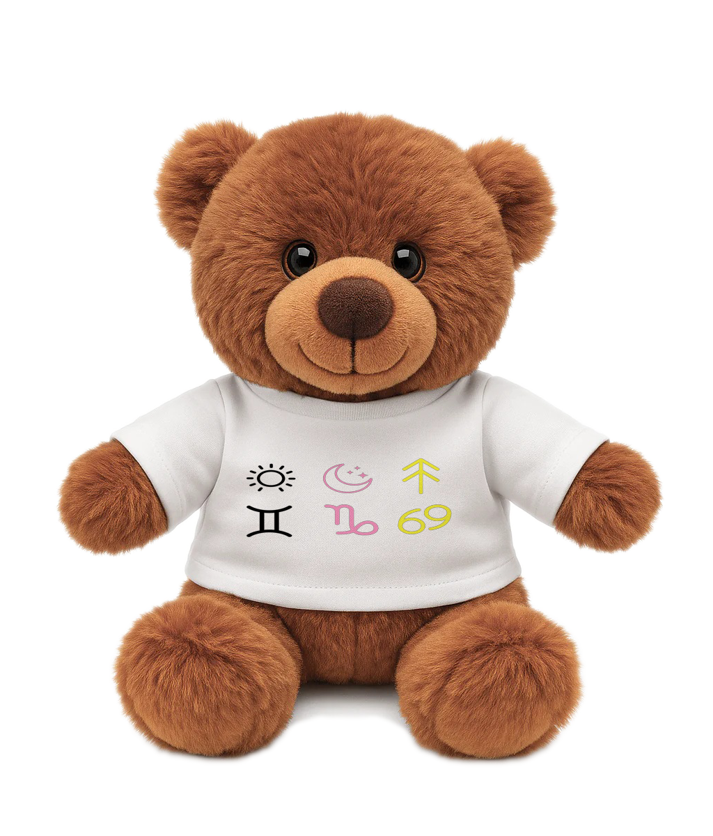 Soft, cuddly, and star-aligned—our Cream Personalised Teddy Bear is the perfect gift for all ages. This super-soft plush bear comes with a detachable printable t-shirt, ready to be customised with a zodiac symbol, star sign traits, or city name. Whether you're celebrating a birthday, sending a care package, or curating a cosmic bundle, this bear adds warmth and personality to every parcel.